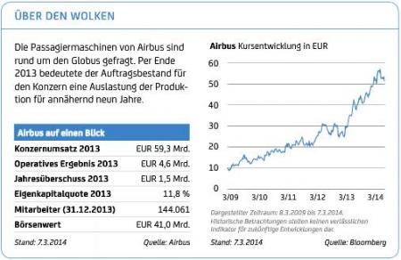 Ein weiterer europäischer Industriekonzern von Weltrang ist Airbus. Beim bis Ende 2013 als EADS firmierenden Luft- und Raumfahrtunternehmen sorgt die starke Nachfrage nach Passagiermaschinen für boomende Geschäfte. 2013 steigerte Airbus den Überschuss um gut ein Fünftel auf 1,47 Milliarden Euro. Bei der Prognose gibt sich Konzernchef Tom Enders vorsichtig. Er rechnet für 2014 mit stabilen Umsätzen. Gleichzeitig plant der Top-Manager beim um Einmaleffekte bereinigten Ergebnis vor Zinsen und Steuern (Ebit) eine stabile Marge. Am Ziel, die Umsatzrendite im kommenden Jahr von zuletzt 6 auf 7 bis 8 Prozent auszubauen, hält Enders fest. Angesichts dieser Aussage erwarten die Analysten von Kepler Cheuvreu für 2015 eine Beschleunigung beim Profit. Zudem sehen sie das Potenzial für eine Erhöhung der 2016er-Prognose. Begründung: Airbus hat angekündigt, im übernächsten Jahr die Produktion des Verkaufsschlagers A320 aufzustocken. Momentan stuft Kepler Cheuvreu die Aktie mit „Kaufen“ ein und taxiert das Kursziel auf 61 Euro. Sechs Euro niedriger ist der Basispreis einer Aktienanleihe auf den Industrietitel angesiedelt. Klettert Airbus bis zum letzten Bewertungstag (19. Februar 2015) auf oder über den Kurs von 55 Euro, wirft die Aktienanleihe den Maximalertrag ab. Andernfalls ist die Lieferung von Aktien vorgesehen, was eine Verlustgefahr mit sich bringen würde. Trotz eines Börsenwertes von mehr als 40 Milliarden Euro sucht man Airbus im DAX® vergeblich. Was schlichtweg daran liegt, dass die Regularien die Aufnahme eines Unternehmens mit Sitz im Ausland nicht vorsehen. Dagegen ist der Flugzeugbauer sowohl im EURO STOXX 50® Index als auch im französischen CAC® 40 Index vertreten.