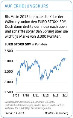 Große Comebacks sind im Sport gang und gäbe. Boxlegende Muhammad Ali schrieb 1974 Geschichte, als er sieben Jahre nach der Aberkennung des Titels Weltmeister George Foreman auf die Bretter schickte. Auch an der Börse geht gerade ein großes Comeback über die Bühne. 2014 könnte als das Jahr in die Geschichte eingehen, in dem sich die Eurozone nach ihrer bisher schwersten Krise zurückmeldet. Allen Horrorszenarien zum Trotz feierte der Euro am 1. Januar seinen 15. Geburtstag. Zum Jubiläum kehrte die Union in die Wachstumsspur zurück. Nach zwei Jahren im Rückwärtsgang rechnet die EU-Kommission damit, dass die Eurozone ihr Bruttoinlandsprodukt (BIP) 2014 um 1,2 Prozent steigern wird. Für das kommende Jahr sieht die Institution sogar eine Wachstumsrate von 1,8 Prozent. „Die Wiederherstellung des Gleichgewichts der europäischen Wirtschaft macht Fortschritte, und die externe Wettbewerbsfähigkeit verbessert sich, insbesondere in den wirtschaftlich schwächsten Ländern“, erklärte EU-Wirtschafts- und Währungskommissar Olli Rehn kürzlich. Getragen wird der Aufschwung zum einen von den Sorgenkindern der vergangenen Jahre. Beispiel Spanien: Der vom Informationsdienstleister Markit berechnete Einkaufsmanagerindex für die viertgrößte Volkswirtschaft der Eurozone notiert seit Kurzem wieder bei mehr als 50 Punkten. Bei Werten über dieser Marke deutet das Stimmungsbarometer Wachstum an. Anfang des Jahres stockte Spaniens Industrie zudem erstmals seit Oktober 2010 die Belegschaft auf. Derweil kann sich die Eurozone weiter auf ihre Wachstumslokomotive verlassen. Im laufenden Jahr traut die EU-Kommission Deutschland eine BIP-Zunahme von 1,8 Prozent zu. 2015 soll die heimische Wirtschaft um zwei Prozent expandieren. Trotz der skizzierten Fortschritte ist es wohl zu früh, Entwarnung zu geben. Auch wenn die schlimmste Phase der Krise inzwischen hinter uns liegen mag, dürfen wir uns jetzt nicht selbstzufrieden zurücklehnen, sagt EU-Kommissar Rehn. In der Tat haben einige Länder nach wie vor mit gravierenden Haushaltsproblemen zu kämpfen. Zwar soll die Eurozone als Ganzes 2014 wieder die Defizitgrenze von drei Prozent des BIP unterschreiten. Sie profitiert jedoch auch hier vor allem von Deutschland. Die Bundesrepublik steuert auf einen ausgeglichenen Staatshaushalt zu. Währenddessen scheitert knapp die Hälfte der Mitglieder nach wie vor an dem zentralen Konvergenzkriterium des Euro-Stabilitätspakts. Anleger müssen also weiterhin die Risiken im Auge behalten. Zumal die Börse seit Längerem ein Comeback der Eurozone für möglich hält, wie beim Blick auf den Verlauf des EURO STOXX 50® Index deutlich wird. Zuletzt schloss die Benchmark mit den 50 größten Bluechips der Eurozone zwei Jahre in Folge mit positiven Vorzeichen ab.