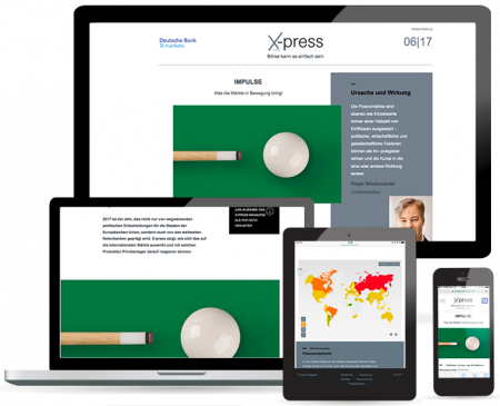 Emittent: Deutsche Bank AG. Emittenten-/Bonitätsrisiko: Bei Zahlungsunfähigkeit des Emittenten besteht das Risiko des Totalverlustes des eingesetzten Kapitals. © Deutsche Bank AG 2017, Stand: 05.05.2017. Die vollständigen Angaben zu den Wertpapieren, insbesondere zu den Bedingungen, sowie Angaben zur Emittentin sind dem jeweiligen Verkaufs prospekt zu entnehmen; dieser ist nebst Nachträgen bei der Deutsche Bank AG, X-markets, Mainzer Landstraße 11-17, 60329 Frankfurt am Main, kostenfrei erhältlich oder kann unter www.xmarkets.de heruntergeladen werden.