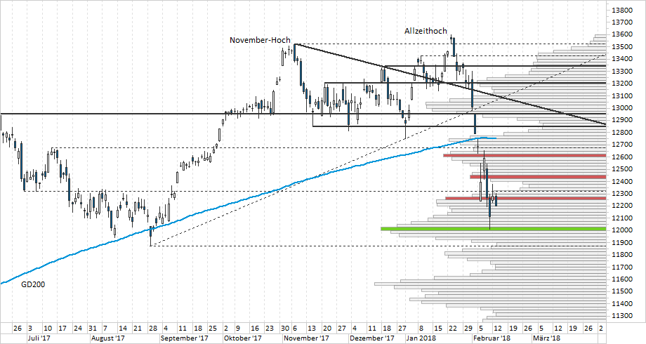 Die Anleger wagten sich am gestrigen Dienstag erneut kaum aus der Deckung und hielten vor den mit Spannung erwarteten US-Verbraucherpreisen (heute um 14.30 Uhr) die Füße still. Dem DAX fehlte dadurch einmal mehr die Kraft - und so blieben die Kurse erneut an der hartnäckigen Widerstandszone (Volumenkante) im Bereich von 12.300 Punkten hängen. In der letzten halben Stunde kam dann sogar noch etwas Verkaufsdruck auf, doch die Delle bzw. der Rutsch unter 12.200 Zähler konnte (dank einer festen Wall Street) nachbörslich direkt wieder ausgebügelt werden. Das heißt ...
