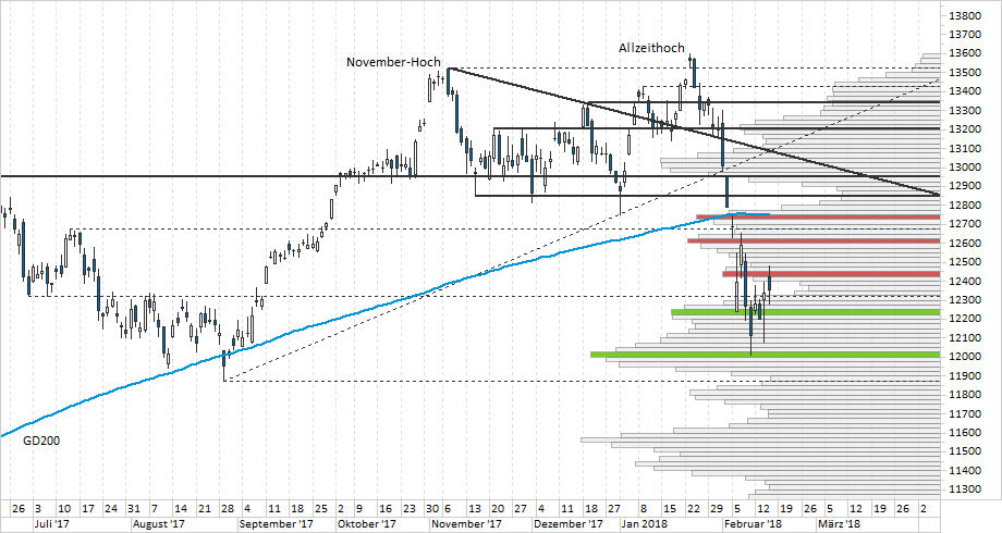 Wahre Sprinterqualitäten zeigt der DAX momentan scheinbar nur im außerbörslichen Handel. So auch gestern, denn nachdem die Kurse über weite Strecken im positiven Bereich notierten und in der Spitze bis auf 12.480 kletterten, reichte eine minimale Schwächephase kurz vor Schluss, um den Tagesgewinn auf magere 0,1% schrumpfen zu lassen. Insgesamt präsentierten sich die Blue Chips aber erneut stabil und verteidigten klar die Volumenkante bei 13.330 Zählern. Gute Aussichten also für ein versöhnliches Wochen-Ende? ...