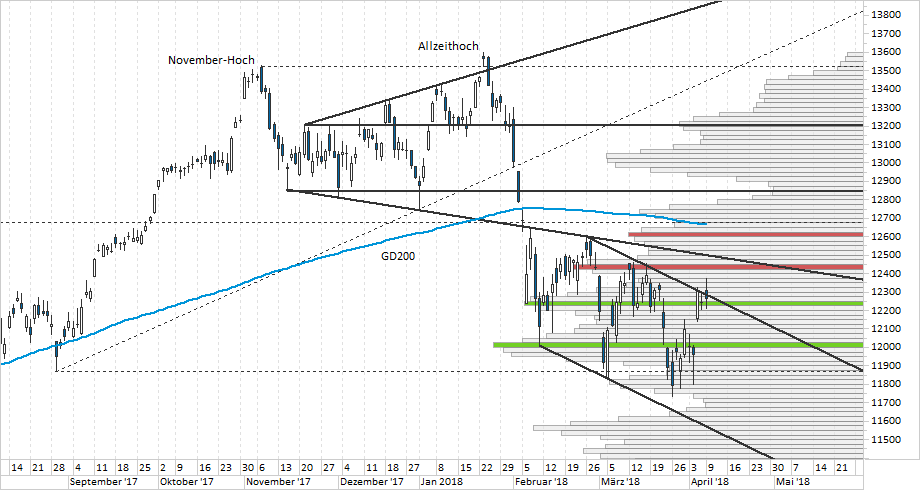 Der deutsche Leitindex startete glänzend aufgelegt in die neue Handelswoche und schob sich im Verlauf der Sitzung bis auf das Intraday-Top bei 12.371 Punkten, immerhin den höchsten Stand seit dem 16. März. Doch die Freude währte nicht lange, denn nachdem der Euro am Nachmittag plötzlich deutlich anzog, reichte es für den DAX - trotz starker Vorgaben von der Wall Street - am Ende nur noch für einen mageren Gewinn von 0,2%. Aus charttechnischer Sicht ist das ein Dämpfer, denn...