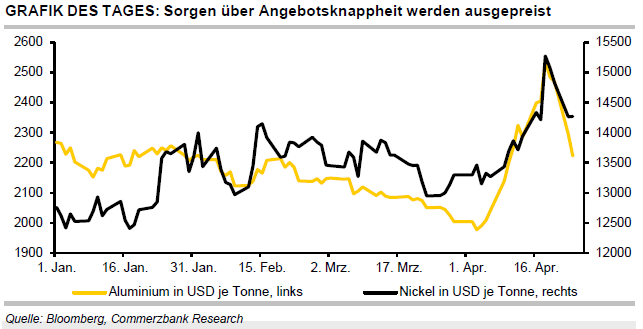 Industriemetalle: Der Aluminiumpreis ist gestern Nachmittag stark unter Druck gekommen, nachdem das US-Finanzministerium eine Aufhebung der Sanktionen gegen Rusal ins Spiel gebracht hat. Voraussetzung hierfür ist, dass der russische Oligarch Oleg Deripaska die Kontrolle an Rusal abgibt. Darüber hinaus hat das US-Finanzministerium die Frist verlängert, bis zu der die Geschäfte mit Rusal abgewickelt werden müssen. Diese läuft jetzt bis zum 23. Oktober (bislang 5. Juni). Das Chaos der letzten beiden Wochen am Aluminiummarkt scheint beendet. Sollten die Sanktionen gegen Rusal aufgehoben oder zumindest gelockert werden, wären die Sorgen über ein knappes Angebot am Weltmarkt u.E. nicht mehr gerechtfertigt. Dann müsste der Aluminiumpreis auch noch weiter fallen. In der Spitze kollabierte der Preis gestern um 9,4%. Den Handel beendete er mit knapp 2.300 USD je Tonne, einem Minus von 7%. Der Preisrückgang setzt sich heute Morgen zeitweise bis auf 2.210 USD fort. Der Nickelpreis stand schon davor unter Druck und wurde von Aluminium weiter nach unten gezogen (zeitweise -6,7% auf 13.800 USD je Tonne), hat sich mittlerweile aber wieder etwas erholt.
