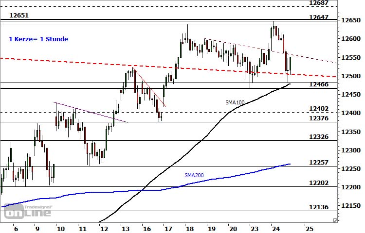 Der DAX konnte gestern im frühen Handel die viertägige Konsolidierung trendkonform nach oben auflösen und in der zweiten Handelsstunde ein 11-Wochen-Hoch bei 12.647 Punkten markieren. Der damit verbundene knappe Ausbruch über das vorausgegangene Verlaufshoch bei 12.640 Punkten erwies sich indes nicht als nachhaltig. Nach der Ausbildung eines Evening-Star-Verkaufsmusters bei den Stundenkerzen setzte ein dynamischer Rücksetzer ein, der den Index bis auf ein im späten Geschäft notiertes Tief bei 12.481 Punkten zurückwarf. An der dort befindlichen Supportzone kam es gegen Handelsende zu einer Stabilisierung.